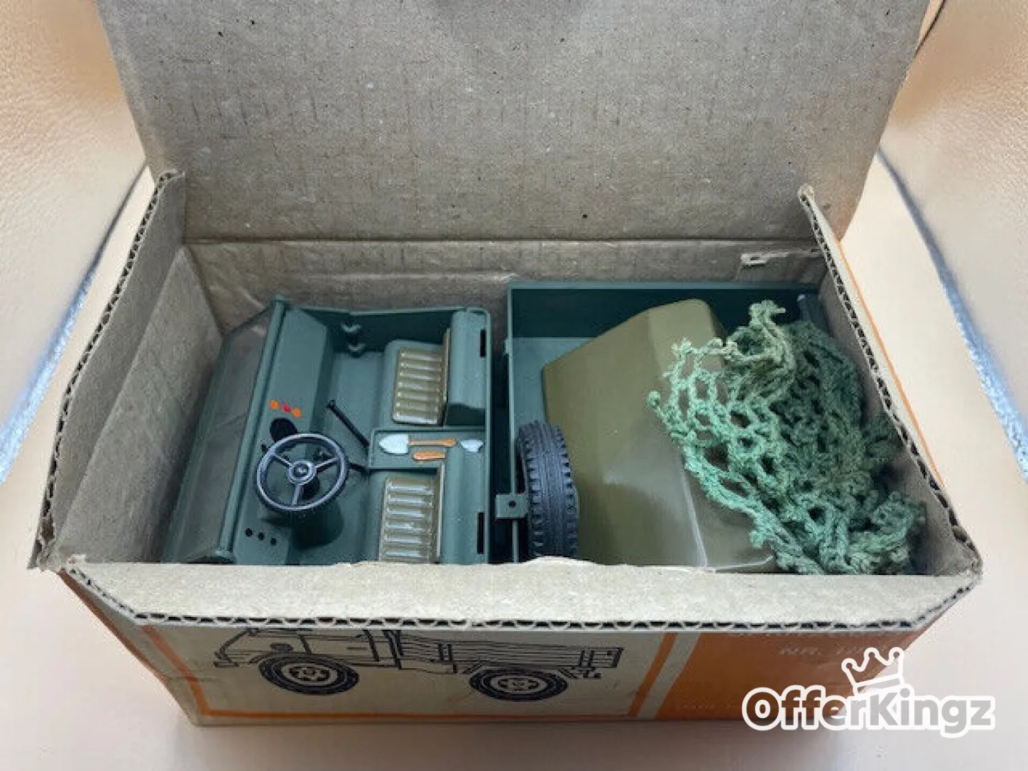 Ausführung mit schmalen lenkbaren Rädern und klappbarer Frontscheibe, Metall-Türen zum öffnen, Mulde zum kippen im Originalkarton.