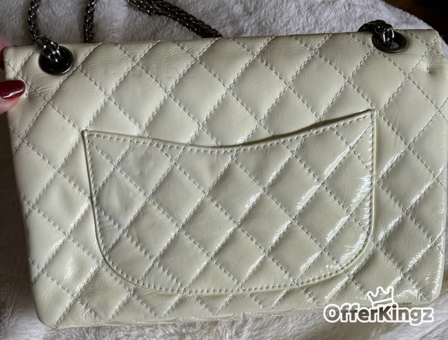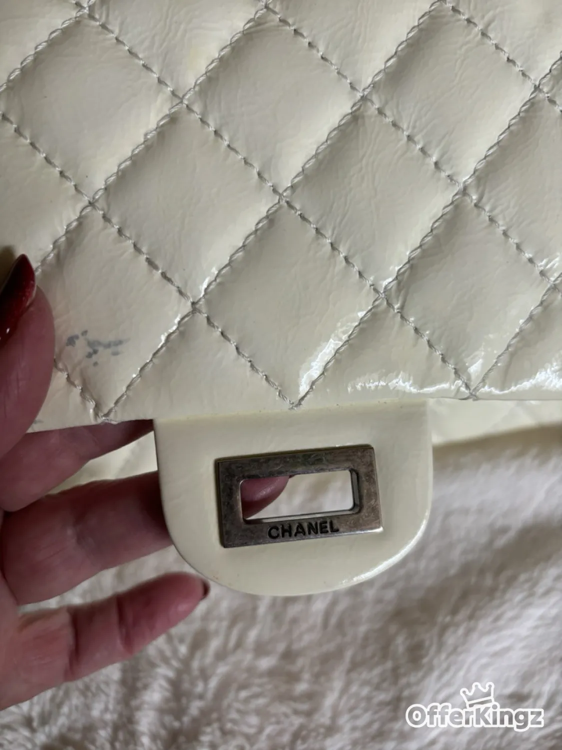 This is a great bag and it’s super clean inside with minor little marks for the strap , outside is patent leather. It’s like a cream off white color. It does have a few callouts with the discoloration on the front and on one corner of the bottom, this is an authentic bag. There are no returns on this bag because of the callouts so make sure you look at all the pictures.