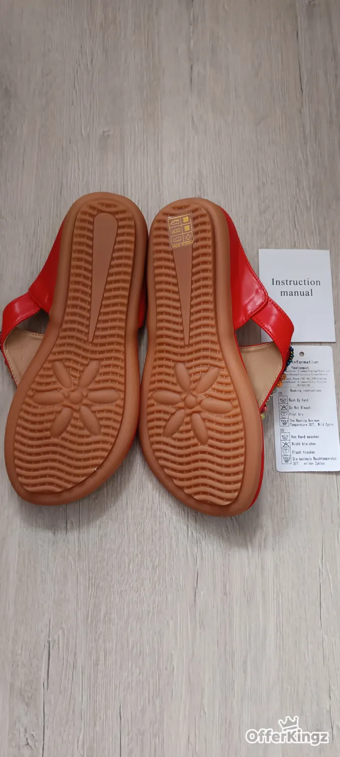 A brand new women's slippers flip flops red size EU 36 China size 37 leather insoles and rubber sole very nice and stylish.