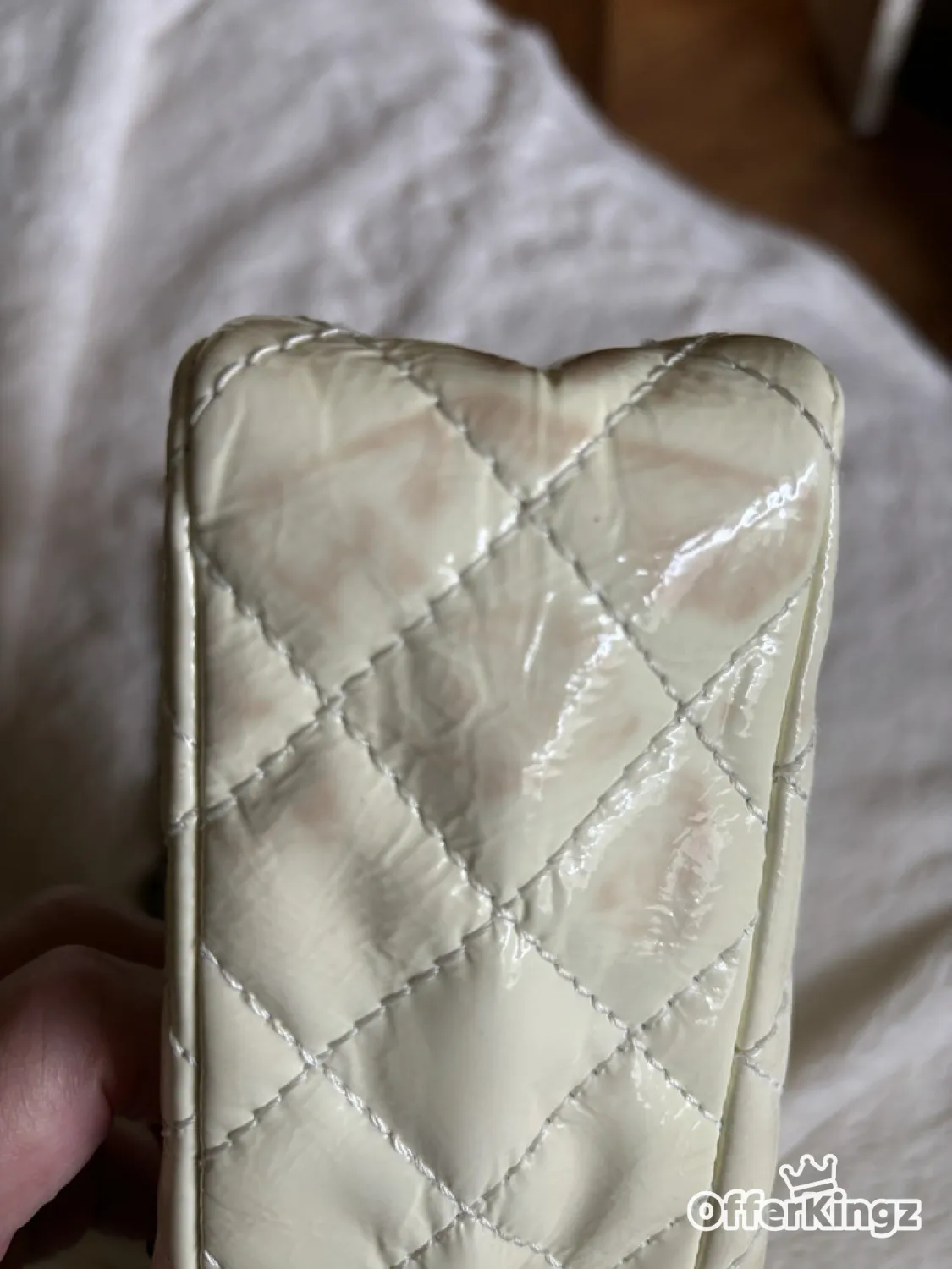 This is a great bag and it’s super clean inside with minor little marks for the strap , outside is patent leather. It’s like a cream off white color. It does have a few callouts with the discoloration on the front and on one corner of the bottom, this is an authentic bag. There are no returns on this bag because of the callouts so make sure you look at all the pictures.