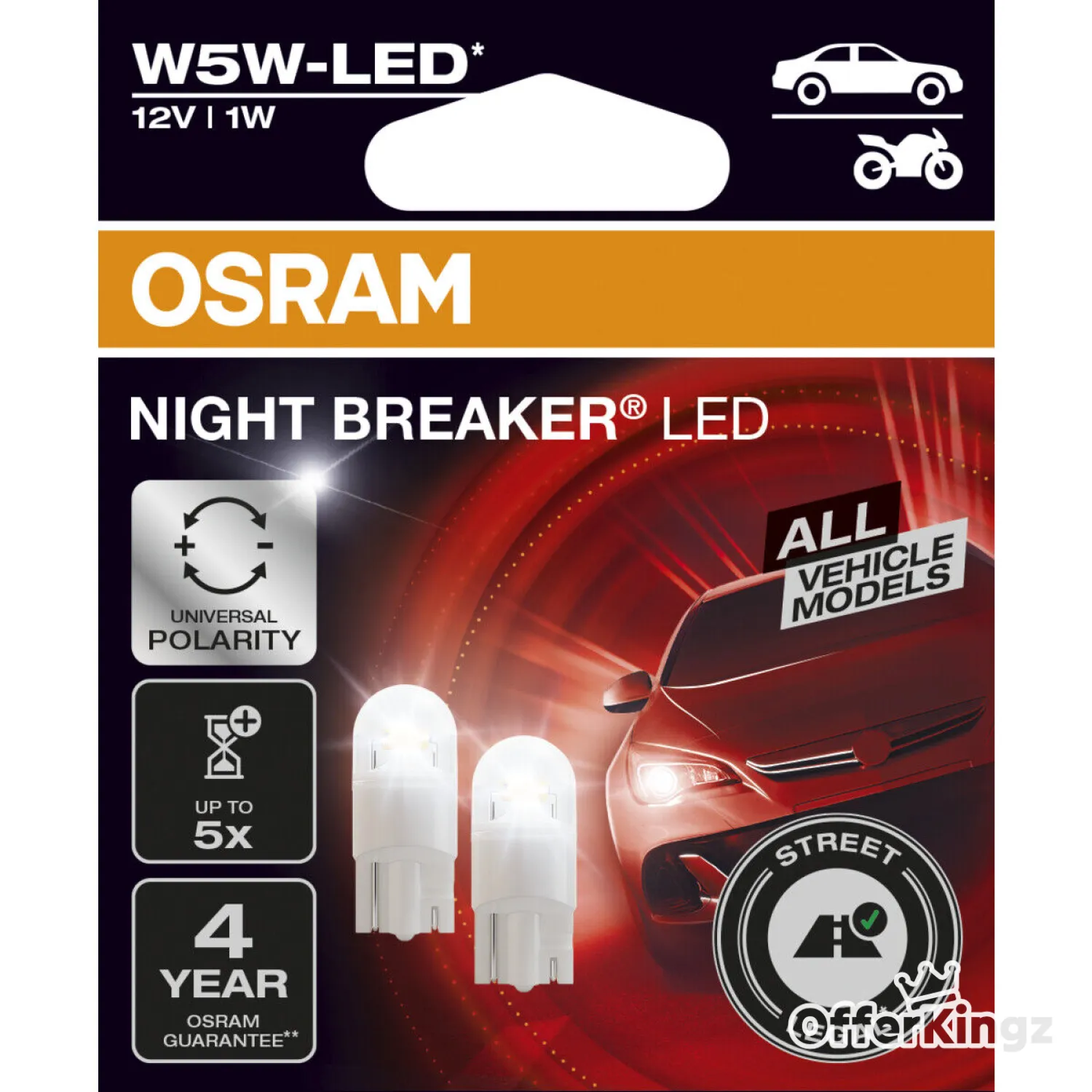 Mit der NIGHT BREAKER W5W-LED ist jetzt die erste straßenzugelassene1) W5W-LED-Ersatzlampe von OSRAM auf dem Markt, die für den Einsatz in allen1) 12V-Fahrzeugmodellen, hinter weißem Glas als Stand-, Positions-, Begrenzungs-, Kennzeichen- und Innenraumleuchte zugelassen ist. Die NIGHT BREAKER W5W-LED Nachrüstlampen sind als Ersatz für herkömmliche W5W-Lampen und -Sockel geeignet. Sie bieten ein modernes und helles weißes Licht mit einer Farbtemperatur von bis zu 5700 Kelvin und einer Leuchtkraft von bis zu 50 lm. Im Vergleich zu konventionellen Leuchtmitteln, wie zum Beispiel Halogenlampen, verbrauchen diese LED-Retrofit-Lampen bis zu 80% weniger Energie. Durch die Plug & Play Lösung und die universelle Polarität können sie schnell und einfach und unabhängig von der Polung installiert werden. Ersetzen Sie jetzt Ihre Fahrzeuglampen durch die revolutionären LED-Nachrüstlampen von OSRAM und erleben Sie zukunftsweisende Helligkeit.
