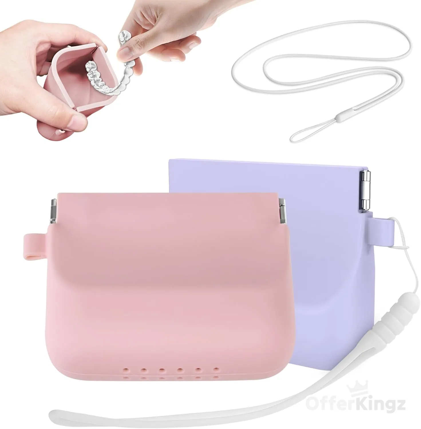 2 Pack Silicone Retainer Case with Lanyard, Durable Soft Denture Case with Vent Holes Compatible for Invisalign, Portable Mouth Guard Case Travel Containers (Pink+Purple)